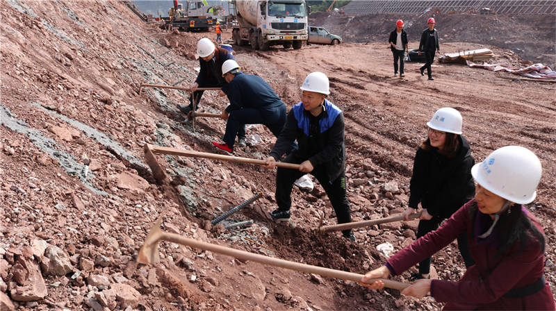 在活動現(xiàn)場,工程部部長劉太亮給大家介紹了雨名快速通道項(xiàng)目建設(shè)情況,高邊坡支護(hù)班組相關(guān)負(fù)責(zé)人現(xiàn)場指導(dǎo)高邊坡支護(hù)防護(hù)工作。全體黨員、入黨積極分子和公司其他員工在工程管理人員指導(dǎo)下,揮鎬舞鋤,積極參與勞動體驗(yàn)。
