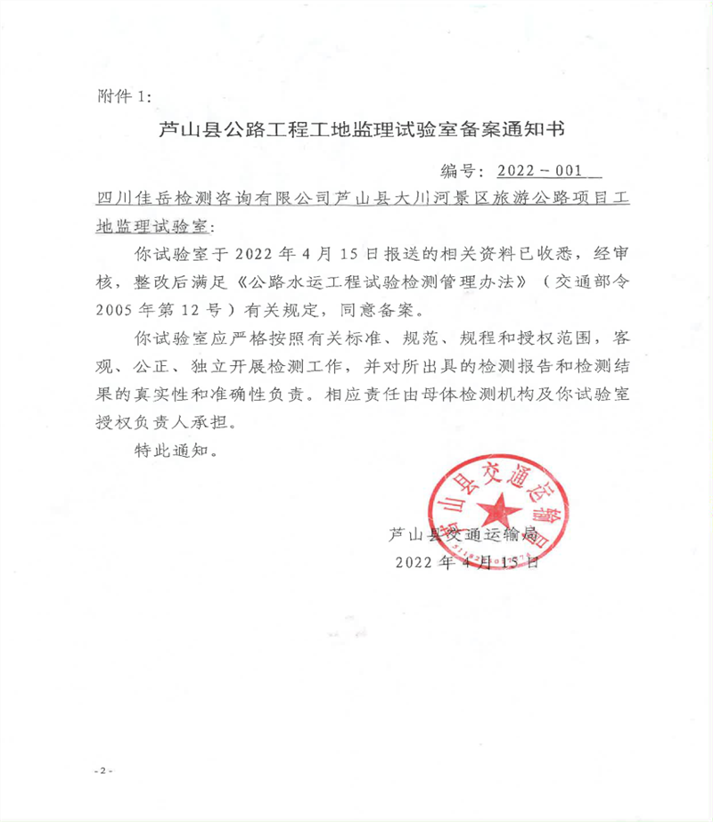 近日,交建集團(tuán)四川佳岳檢測(cè)咨詢有限公司蘆山縣大川河景區(qū)旅游公路項(xiàng)目監(jiān)理試驗(yàn)室,通過蘆山縣交通運(yùn)輸局備案驗(yàn)收,標(biāo)志著佳岳公司蘆山監(jiān)理試驗(yàn)室對(duì)蘆山縣大川河景區(qū)旅游公路項(xiàng)目可以獨(dú)立開展母體授權(quán)參數(shù)內(nèi)的檢測(cè)工作,出具相應(yīng)的檢測(cè)報(bào)告。