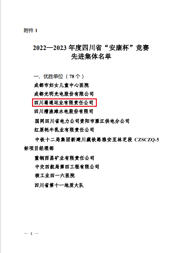 日前,省總工會、省應(yīng)急管理廳、省衛(wèi)健委聯(lián)合發(fā)文表揚2022-2023年度四川省“安康杯”競賽先進集體和先進個人,蜀通公司被評為“優(yōu)勝單位”。