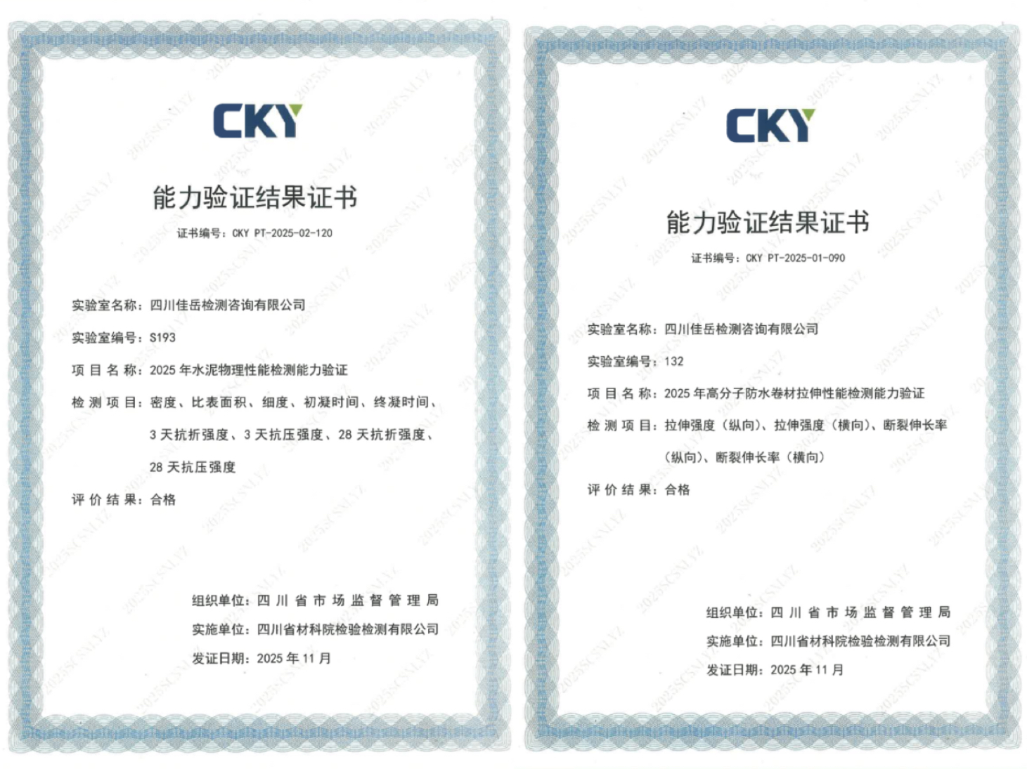 近日,佳岳公司順利完成2025年度檢測能力驗(yàn)證工作,“高分子防水卷材拉伸性能檢測”與“水泥物理性能檢測”兩項(xiàng)項(xiàng)目結(jié)果均獲“滿意”評價。