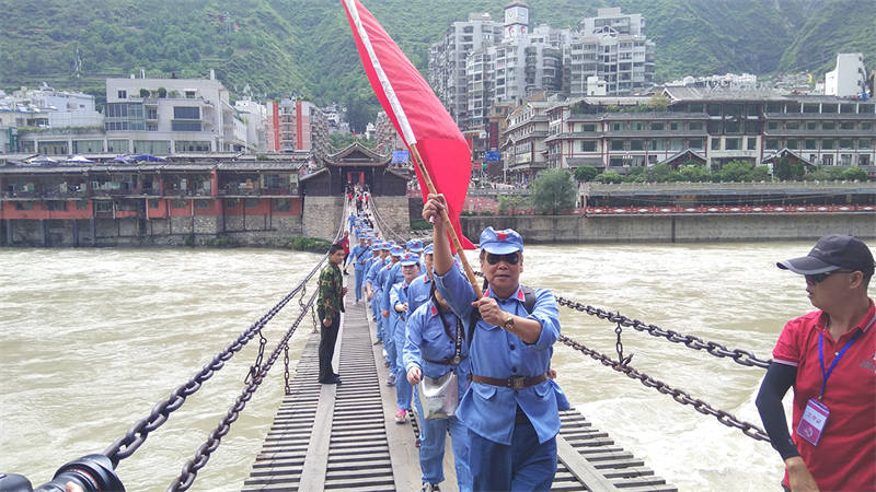 活動中,全體黨員干部職工換上紅軍服、戴上紅軍帽,走上瀘定橋,觸摸著沾染了無數(shù)革命烈士鮮血的鐵索,瞬間將大家的思緒拉回到1935年的5月29日,22名勇士冒著敵人的槍林彈雨,攀著鐵鏈沖向?qū)Π叮⒂聤Z下瀘定橋,取得長征中的一次決定性勝利場景。大家無不被革命先輩的英勇與無畏所震撼。