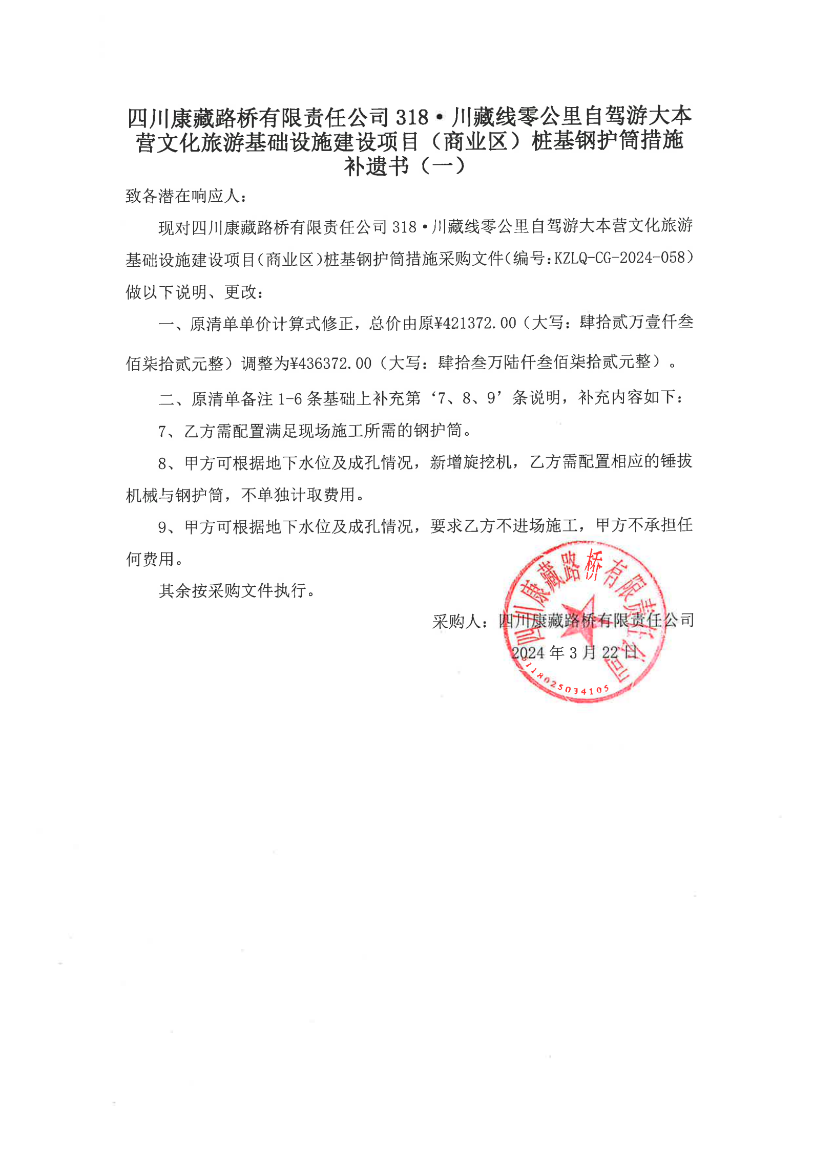 四川康藏路橋有限責任公司318·川藏公路零公里自駕游大本營文化旅游基礎設施建設項目(商業(yè)區(qū))樁基鋼護筒措施補遺書(一)
