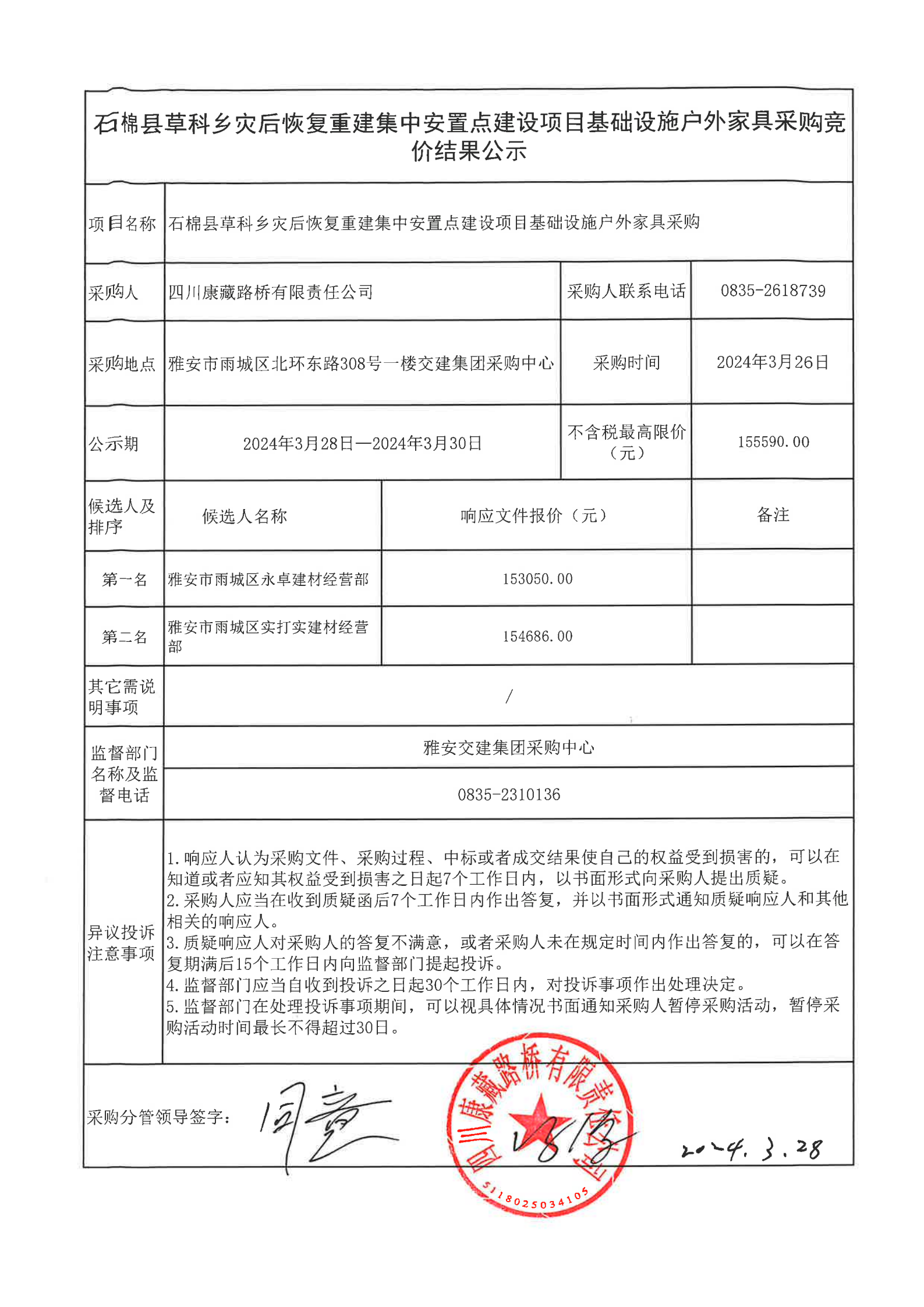 四川康藏路橋有限責(zé)任公司石棉縣草科鄉(xiāng)災(zāi)后恢復(fù)重建集中安置點建設(shè)項目基礎(chǔ)設(shè)施戶外家具采購競價結(jié)果公示
