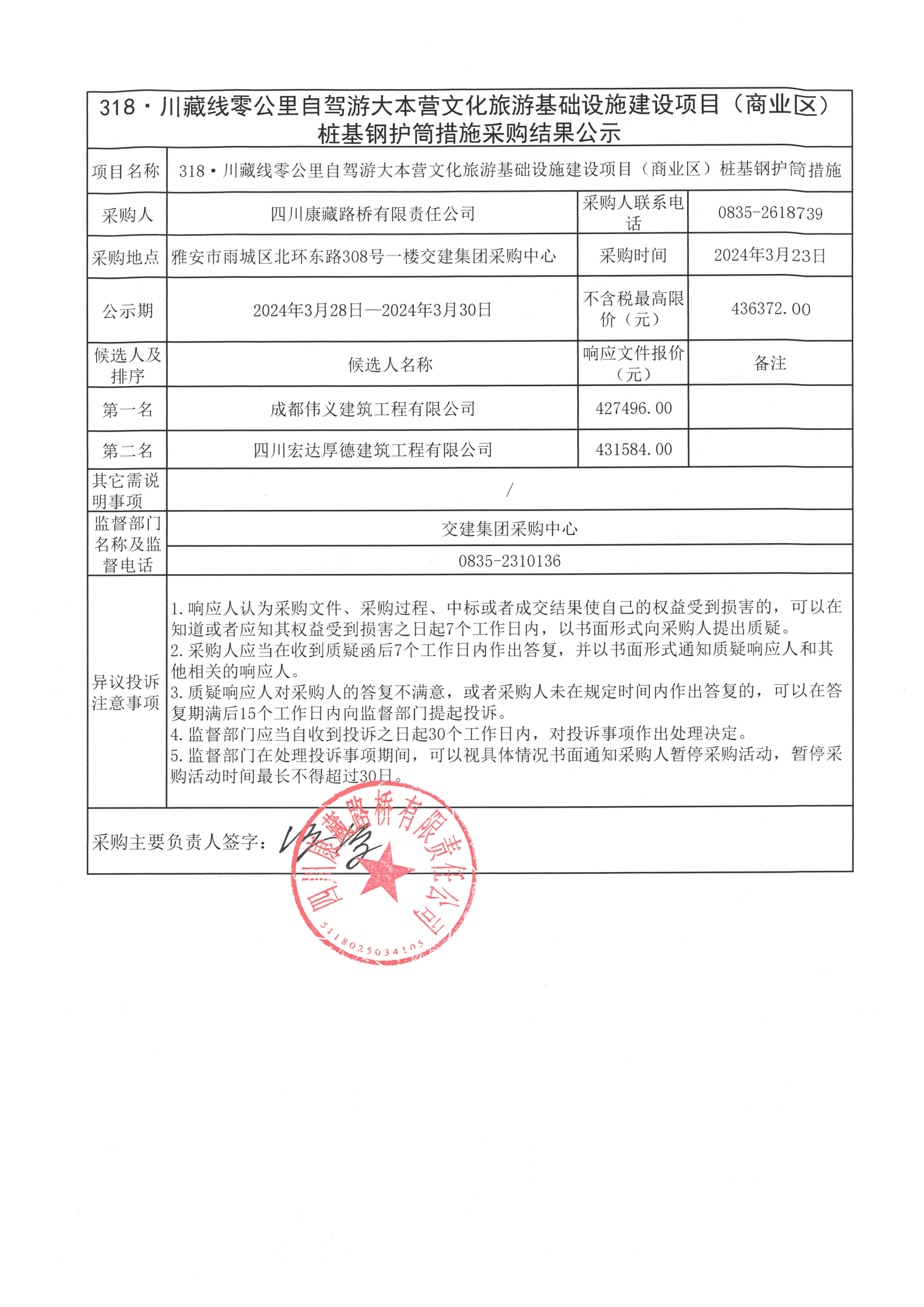 四川康藏路橋有限責任公司318·川藏公路零公里自駕游大本營文化旅游基礎設施建設項目(商業(yè)區(qū))樁基鋼護筒措施采購結(jié)果公示