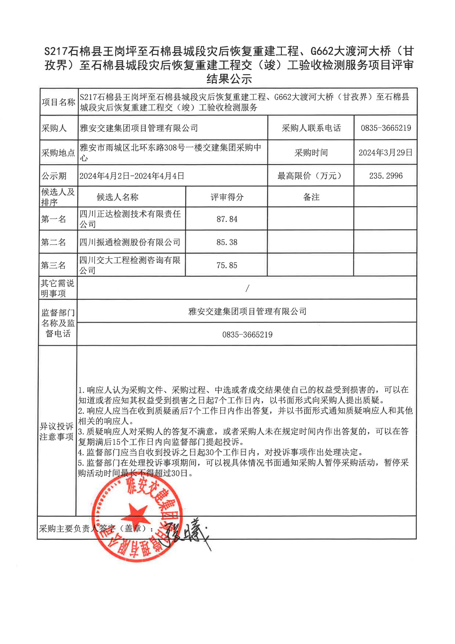 雅安交建集團項目管理有限公司S217石棉縣王崗坪至石棉縣城段災(zāi)后恢復(fù)重建工程、G662大渡河大橋(甘孜界)至石棉縣城段災(zāi)后恢復(fù)重建工程交(竣)工驗收檢測服務(wù)項目評審結(jié)果公示