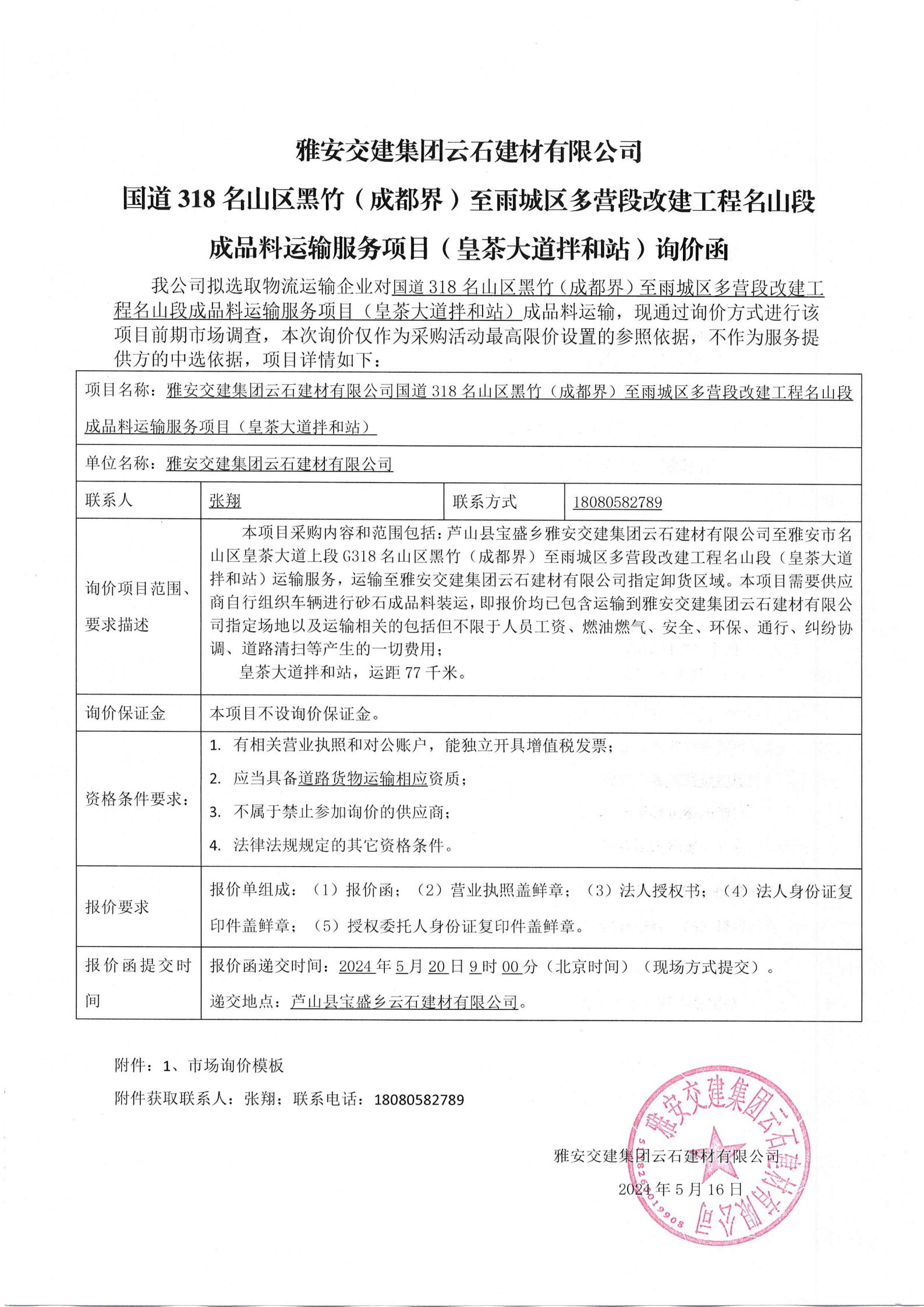 雅安交建集團云石建材有限公司國道318名山區(qū)黑竹(成都界)至雨城區(qū)多營段改建工程名山段成品料運輸服務項目(皇茶大道拌和站)詢價函