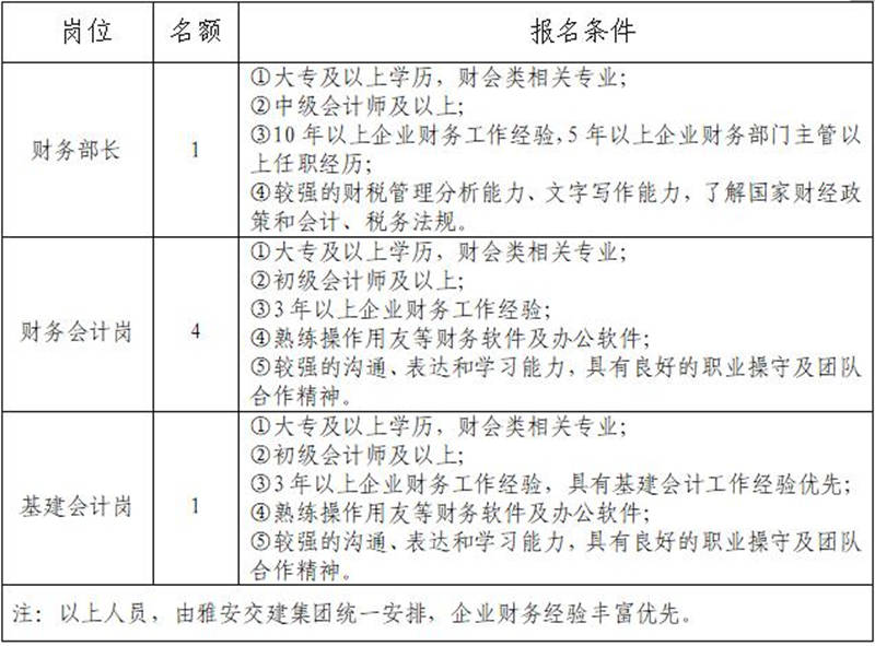 根據(jù)發(fā)展需要,決定面向社會(huì)公開招聘雅安市交通建設(shè)(集團(tuán))有限責(zé)任公司(以下簡(jiǎn)稱“雅安交建集團(tuán)”)所屬子公司財(cái)務(wù)部門負(fù)責(zé)人1名,工作人員5名,現(xiàn)將有關(guān)事項(xiàng)公告如下:
