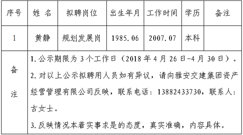 通過(guò)公開(kāi)報(bào)名、資格審查、面試等程序,經(jīng)雅安交建集團(tuán)資產(chǎn)經(jīng)營(yíng)管理有限公司研究擇優(yōu)確定以下1名擬聘用人員,現(xiàn)公示名單如下: