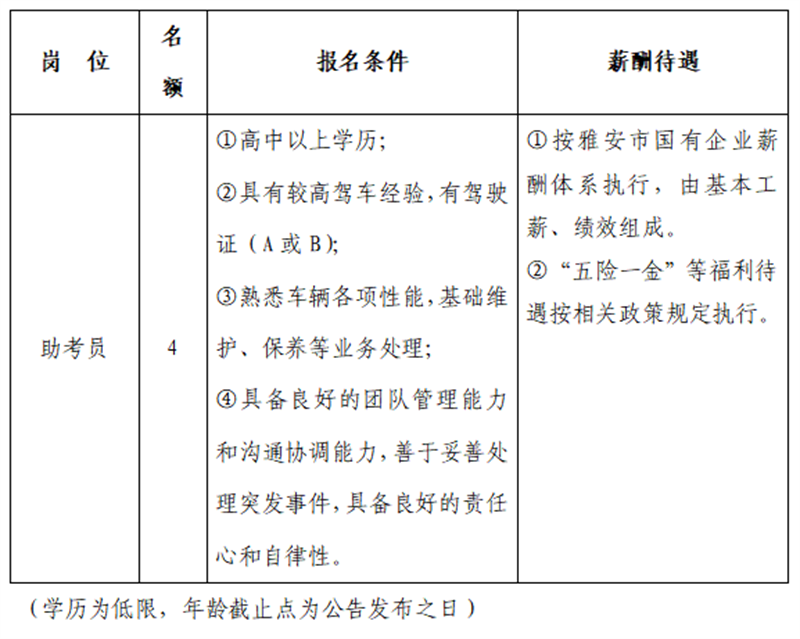 雅安交建集團(tuán)平順檢測有限公司主要經(jīng)營項(xiàng)目為機(jī)動(dòng)車安全技術(shù)檢驗(yàn)、機(jī)動(dòng)車駕駛員培訓(xùn)(科目二、三適應(yīng)性訓(xùn)練)、機(jī)動(dòng)車環(huán)保定期檢驗(yàn)、汽車綜合性能檢測等相關(guān)業(yè)務(wù)。因業(yè)務(wù)發(fā)展需要面向社會(huì)招聘人員,特公告如下: