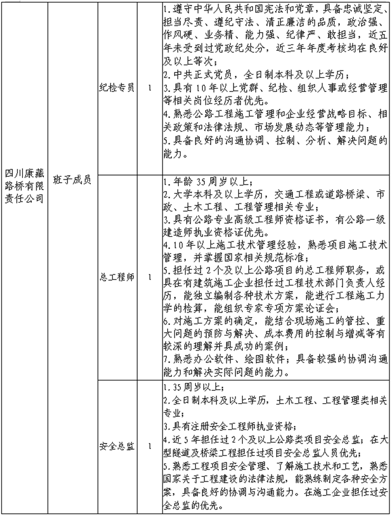 根據(jù)發(fā)展需要,決定面向社會(huì)公開招聘雅安市交通建設(shè)(集團(tuán))有限責(zé)任公司(以下簡稱“雅安交建集團(tuán)”)所屬子公司班子成員4名,現(xiàn)將有關(guān)事項(xiàng)公告如下: