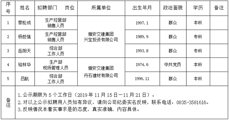 根據(jù)集團(tuán)公司《人才選聘實(shí)施辦法》,通過(guò)公告報(bào)名、資格審查、綜合測(cè)試等各項(xiàng)招聘程序,現(xiàn)對(duì)以下擬聘用人員予以公示: