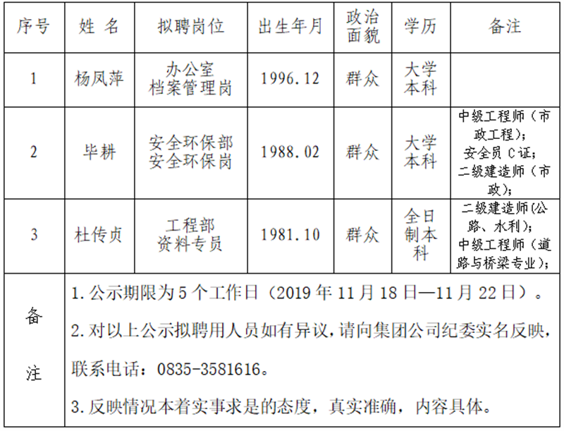 通過公開報名、資格審查、面試等程序,經(jīng)雅安交建集團(tuán)資產(chǎn)經(jīng)營管理有限公司研究擇優(yōu)確定以下3名擬聘用人員,現(xiàn)公示名單如下: