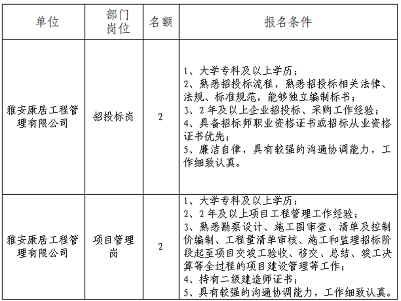 根據(jù)發(fā)展需要,決定面向社會(huì)公開(kāi)招聘雅安市交通建設(shè)(集團(tuán))有限責(zé)任公司(以下簡(jiǎn)稱(chēng)“雅安交建集團(tuán)”)所屬子公司工作人員4名,現(xiàn)將有關(guān)事項(xiàng)公告如下: