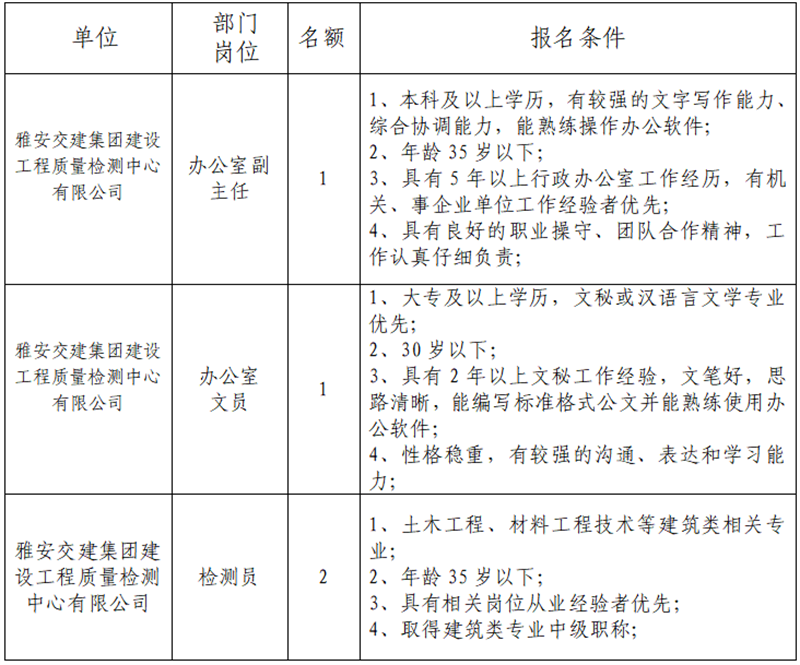 根據發(fā)展需要,決定面向社會公開招聘雅安市交通建設(集團)有限責任公司(以下簡稱“雅安交建集團”)所屬子公司工作人員4名,現(xiàn)將有關事項公告如下: