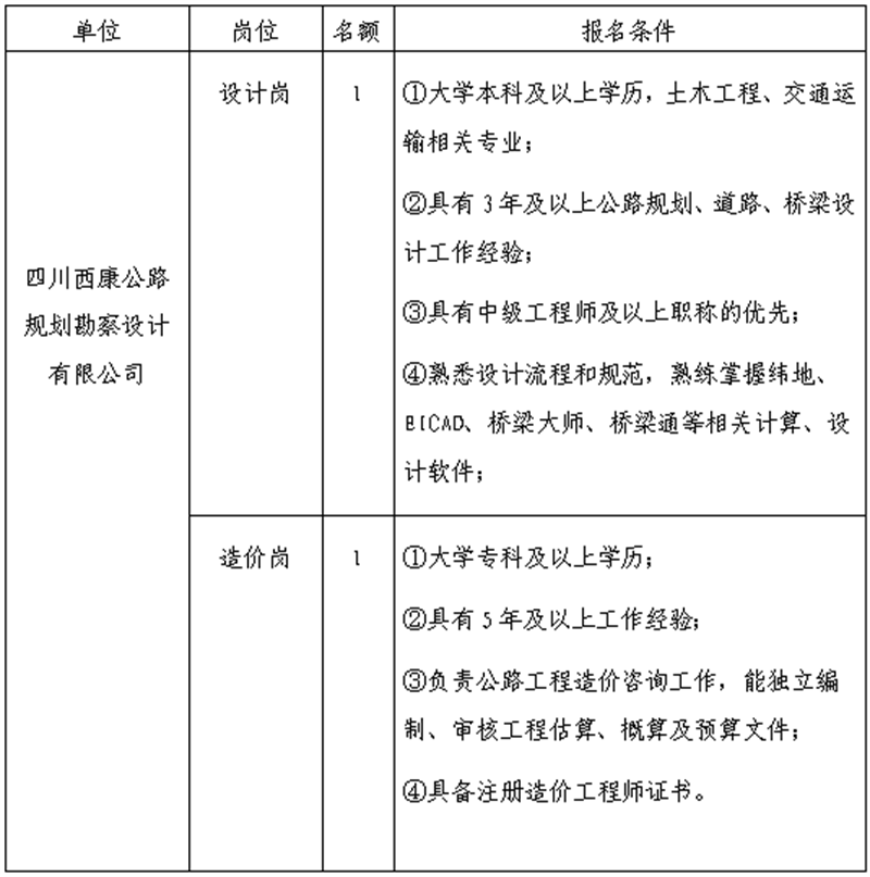 根據(jù)發(fā)展需要,決定面向社會公開招聘雅安市交通建設(集團)有限責任公司(以下簡稱“雅安交建集團”)所屬子公司工作人員2名,現(xiàn)將有關事項公告如下: