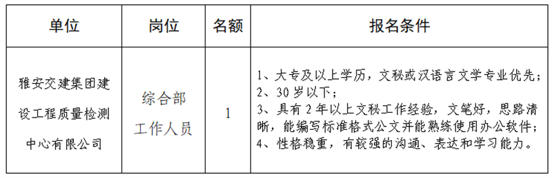 根據(jù)發(fā)展需要,決定面向社會公開招聘雅安市交通建設(shè)(集團)有限責任公司(以下簡稱“雅安交建集團”)所屬子公司工作人員1名,現(xiàn)將有關(guān)事項公告如下:
