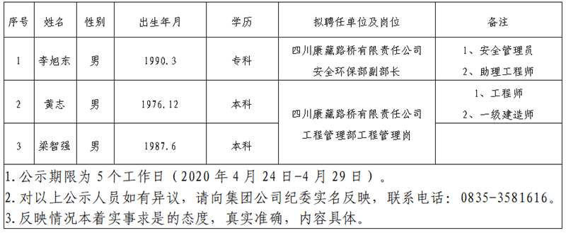 根據(jù)雅安市交通建設(shè)(集團)有限責(zé)任公司招聘公告,經(jīng)公開報名、資格初審、筆試、面試、體檢考察等環(huán)節(jié),現(xiàn)將以下3名擬聘用人員予以公示: