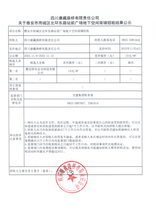 四川康藏路橋有限責(zé)任公司關(guān)于雅安市雨城區(qū)北環(huán)東路站前廣場地下空間商鋪招租結(jié)果公示