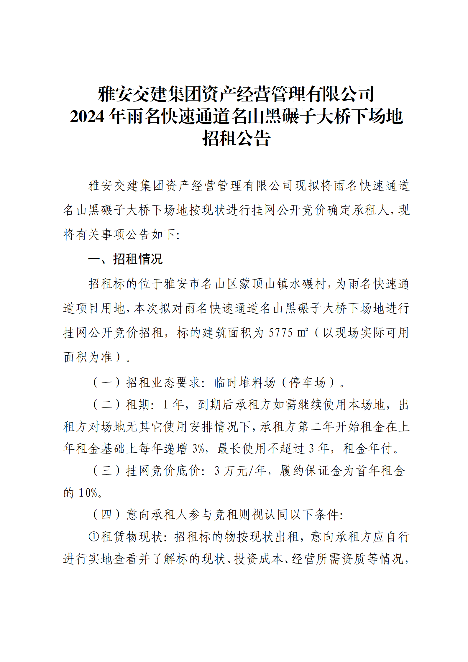 雅安交建集團(tuán)資產(chǎn)經(jīng)營管理有限公司2024年雨名快速通道名山黑碾子大橋下場地招租公告