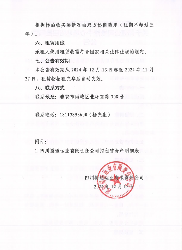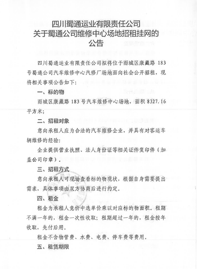 四川蜀通運業(yè)有限責(zé)任公司 關(guān)于蜀通公司維修中心場地招租掛網(wǎng)的 公告
