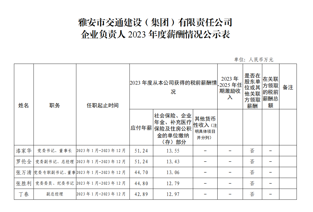 雅安市交通建設(shè)(集團)有限責任公司 企業(yè)負責人2023年度薪酬情況公示表