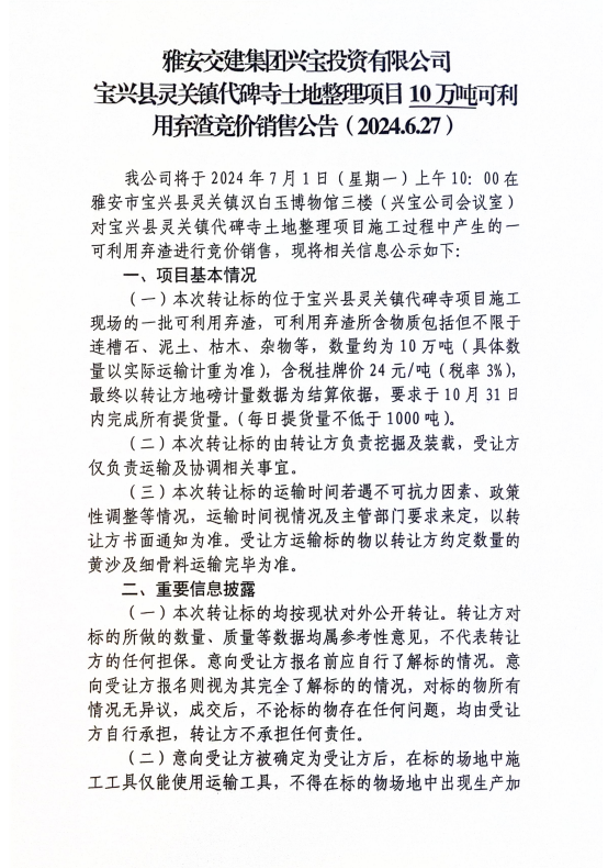 雅安交建集團(tuán)興寶投資有限公司寶興縣靈關(guān)鎮(zhèn)代碑寺土地整理項(xiàng)目10萬(wàn)噸可利用棄渣競(jìng)價(jià)銷售公告(2024.6.21)