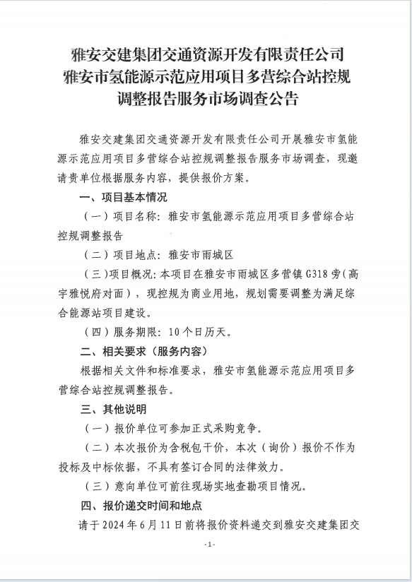 雅安交建集團交通資源開發(fā)有限責(zé)任公司雅安市氫能源示范應(yīng)用項目多營綜合站控規(guī)調(diào)整報告服務(wù)市場調(diào)查公告
