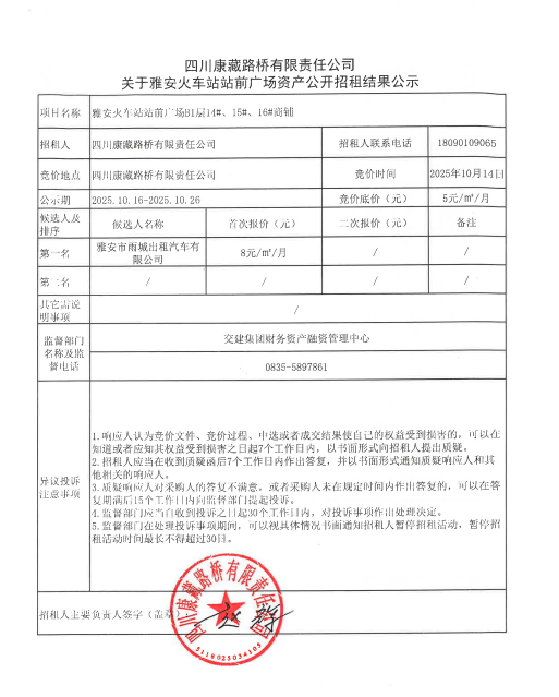 四川康藏路橋有限責(zé)任公司關(guān)于雅安火車(chē)站站前廣場(chǎng)資產(chǎn)公開(kāi)招租結(jié)果公示