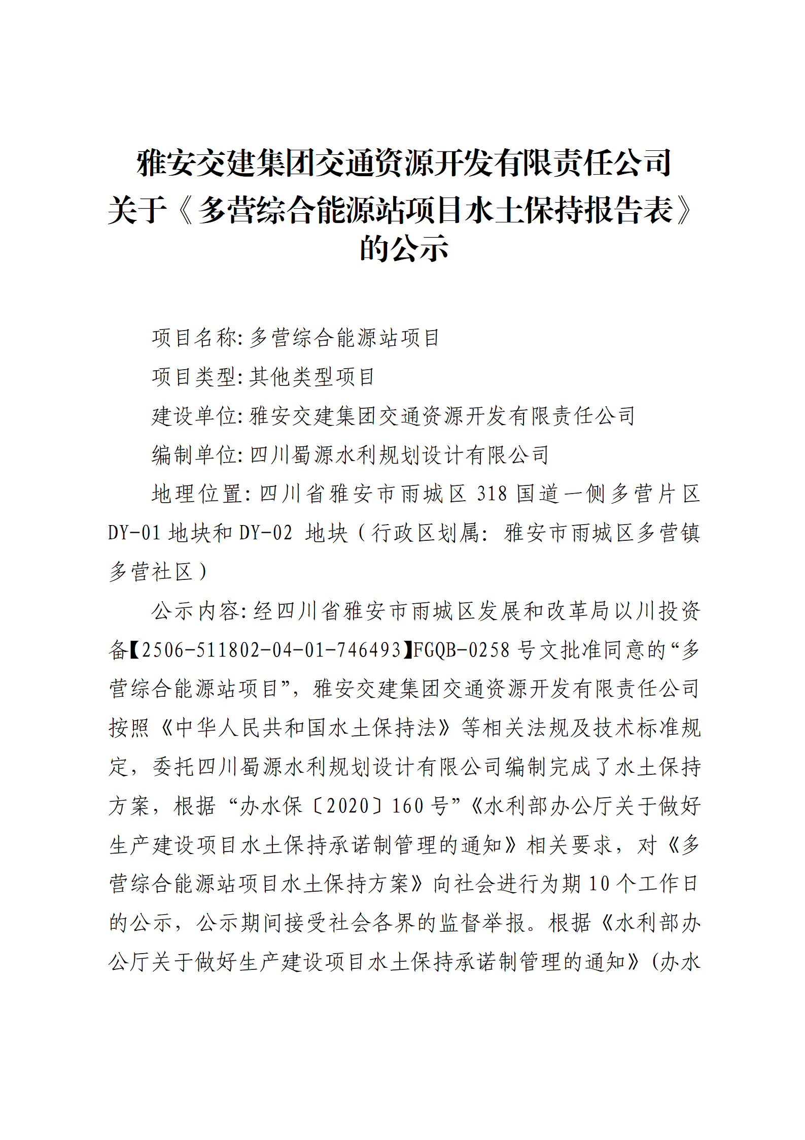 ÑŰ²½»½¨¼¯ˆF½»Í¨ÙYÔ´é_°l(f¨¡)ÓÐÏÞØŸÈι«Ë¾ êP(gu¨¡n)ÓÚ¡¶¶à I¾CºÏÄÜÔ´Õ¾í—ĿˮÍÁ±£³Öˆó¸æ±í¡·µÄ¹«Ê¾