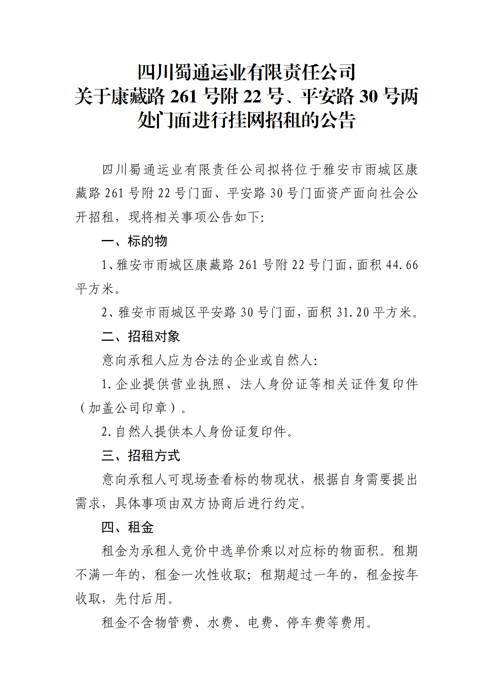 四川蜀通運業(yè)有限責(zé)任公司 關(guān)于康藏路261號附22號、平安路30號兩處門面進(jìn)行掛網(wǎng)招租的公告
