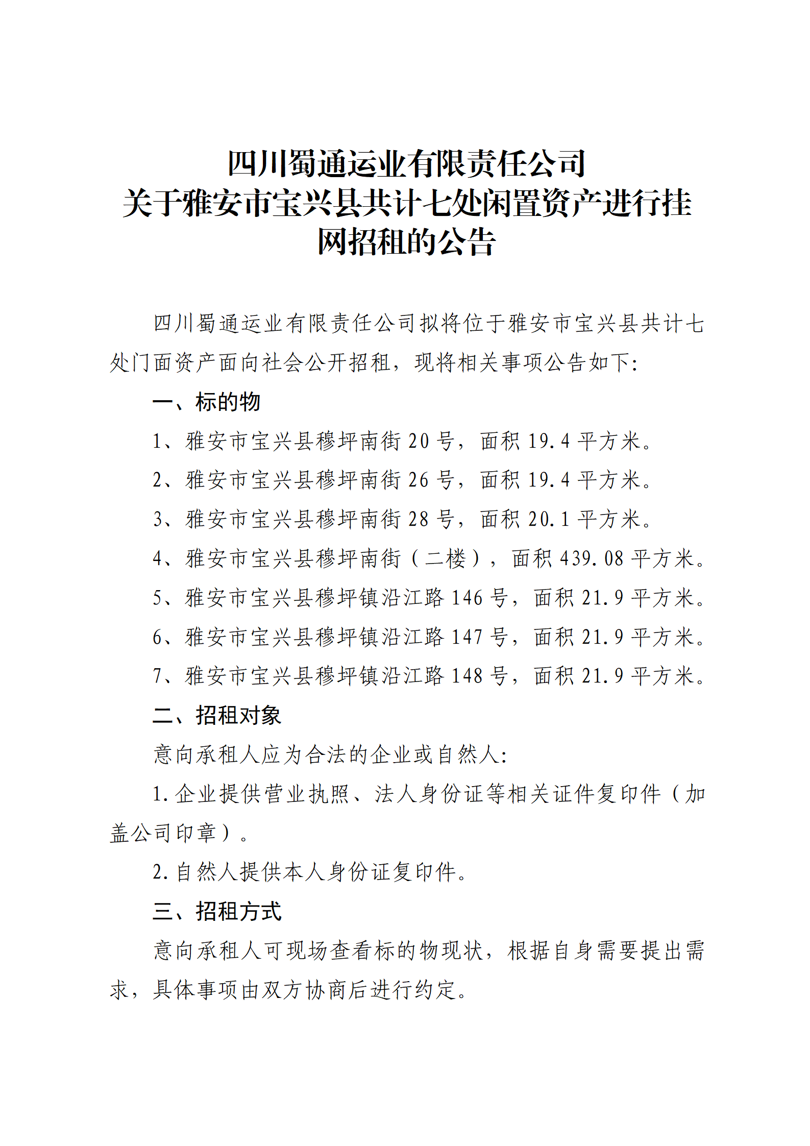 四川蜀通運業(yè)有限責任公司 關(guān)于雅安市寶興縣共計七處閑置資產(chǎn)進行掛網(wǎng)招租的公告