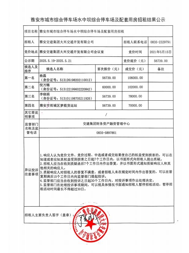 雅安市城市綜合停車場(chǎng)水中壩綜合停車場(chǎng)及配套用房招租結(jié)果公示
