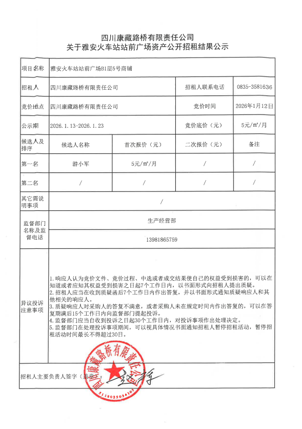 四川康藏路橋有限責(zé)任公司關(guān)于雅安火車站站前廣場(chǎng)資產(chǎn)公開(kāi)招租結(jié)果公示
