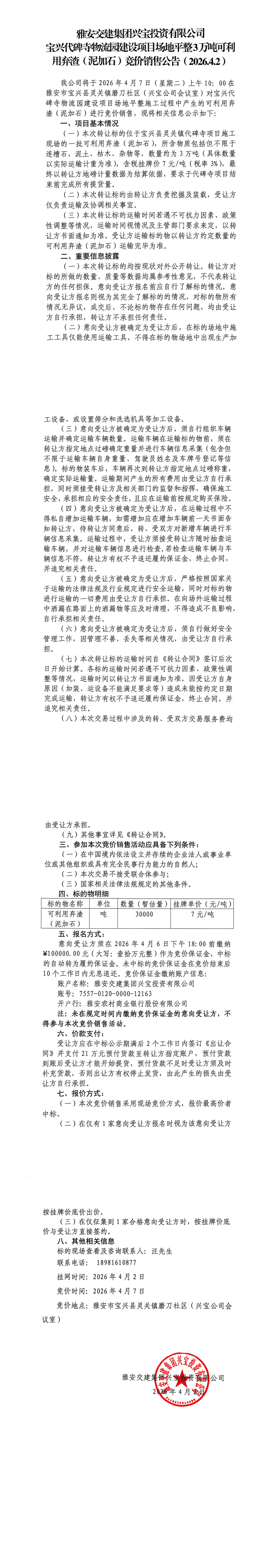雅安交建集團(tuán)興寶投資有限公司 寶興代碑寺物流園建設(shè)項(xiàng)目場(chǎng)地平整3萬(wàn)噸可利用棄渣(泥加石)競(jìng)價(jià)銷售公告