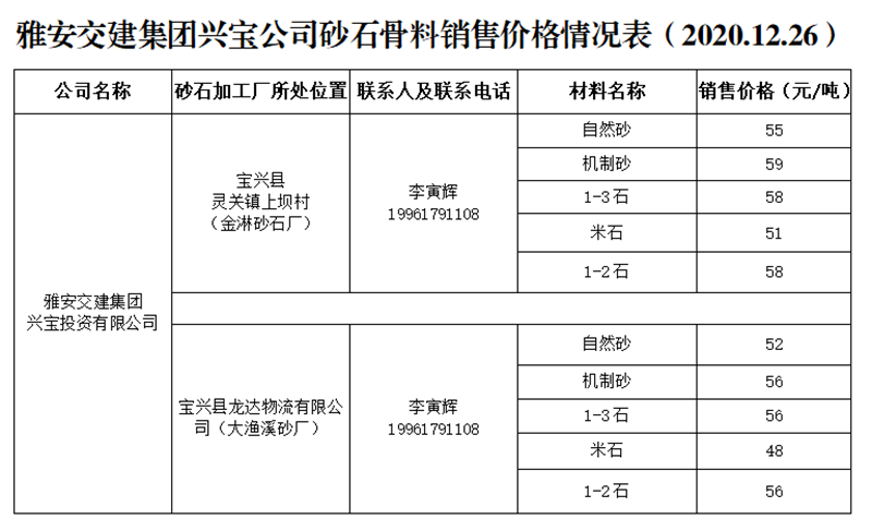 雅安交建集團(tuán)興寶公司砂石骨料銷售價格情況表(2020.12.26)