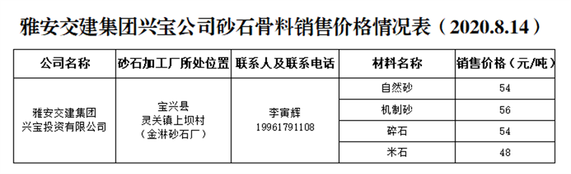 雅安交建集團興寶公司砂石骨料銷售價格情況表(2020.8.14)