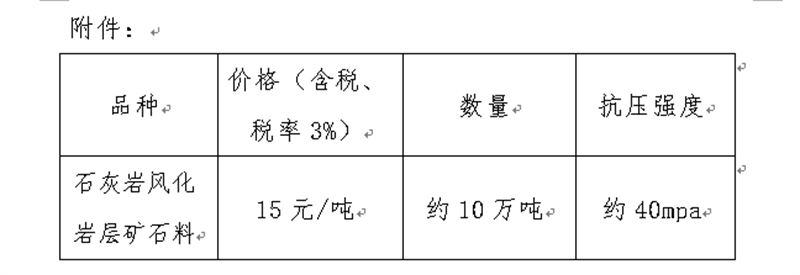 現(xiàn)將我公司礦山首采平臺的石灰?guī)r風(fēng)化巖層礦石料定價出售事宜進行公示(見附件),經(jīng)公司研究決定,定價出售風(fēng)化巖層礦石料約10萬噸,現(xiàn)通過集團公司官網(wǎng)信息公示后對外銷售。報名客戶數(shù)不限,銷售方式為先款后貨,簽約銷售,銷售時間以礦山開采和生產(chǎn)計劃為準(zhǔn)。