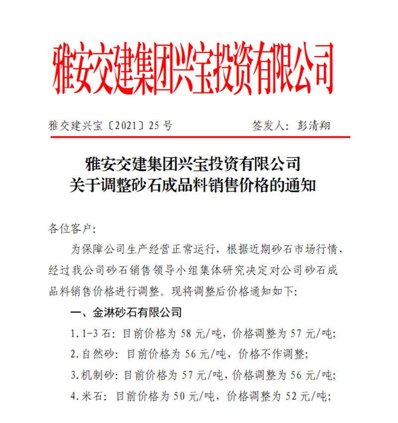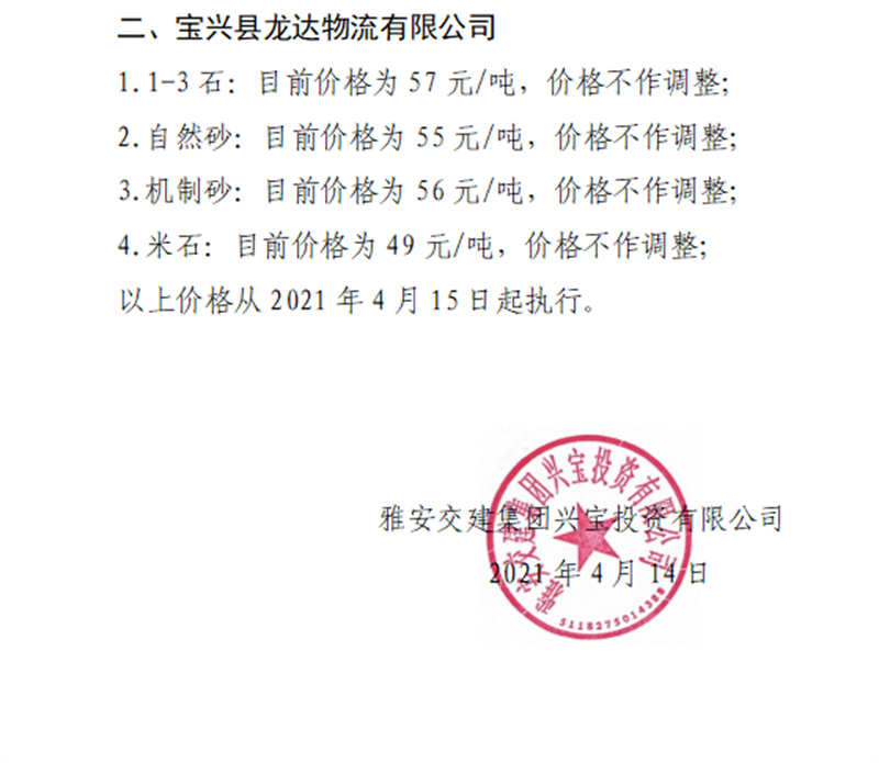 雅安交建集團(tuán)興寶公司砂石骨料銷(xiāo)售價(jià)格情況表(2021.4.15)