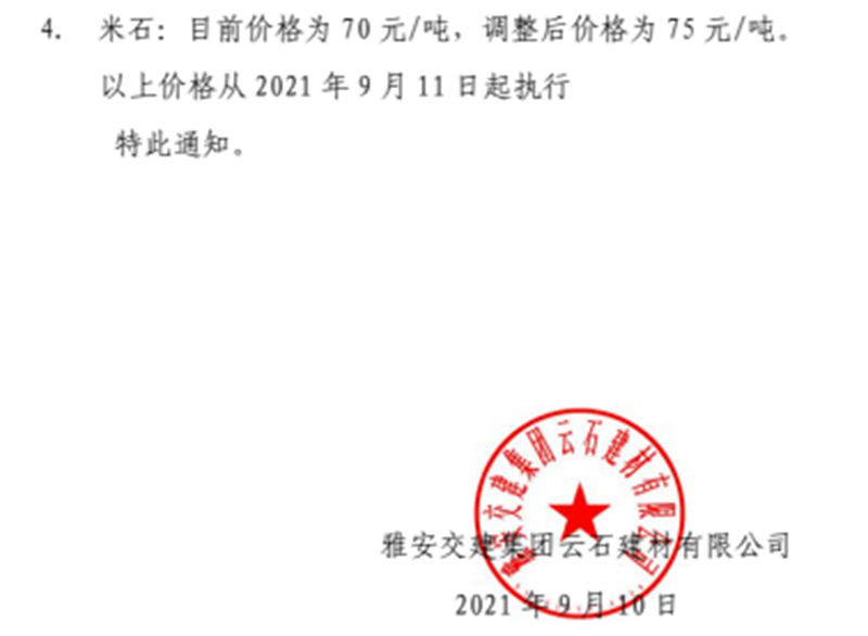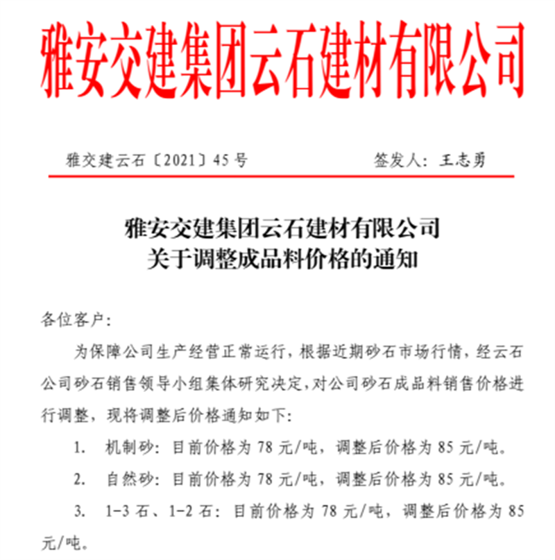 雅安交建集團(tuán)云石公司關(guān)于調(diào)整成品料銷(xiāo)售價(jià)格的通知(2021.11.4)