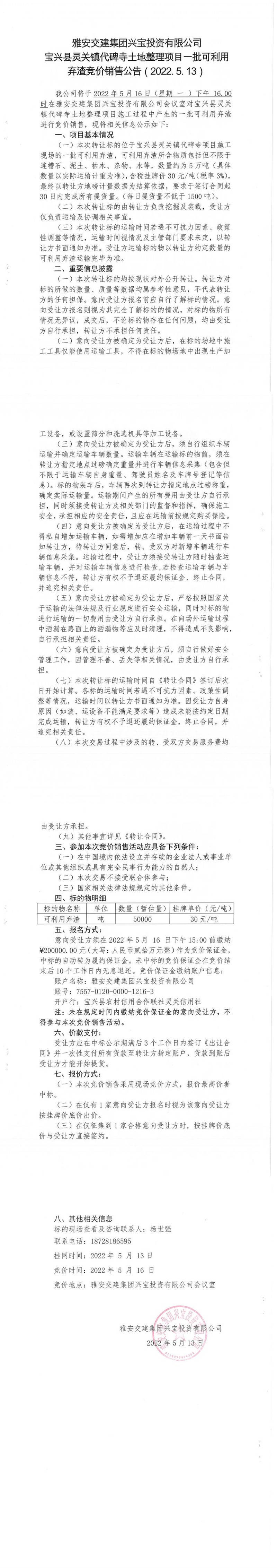 雅安交建集團(tuán)興寶投資有限公司寶興縣靈關(guān)鎮(zhèn)代碑寺土地整理項目一批可利用棄渣竟價銷售公告(2022.5.13)