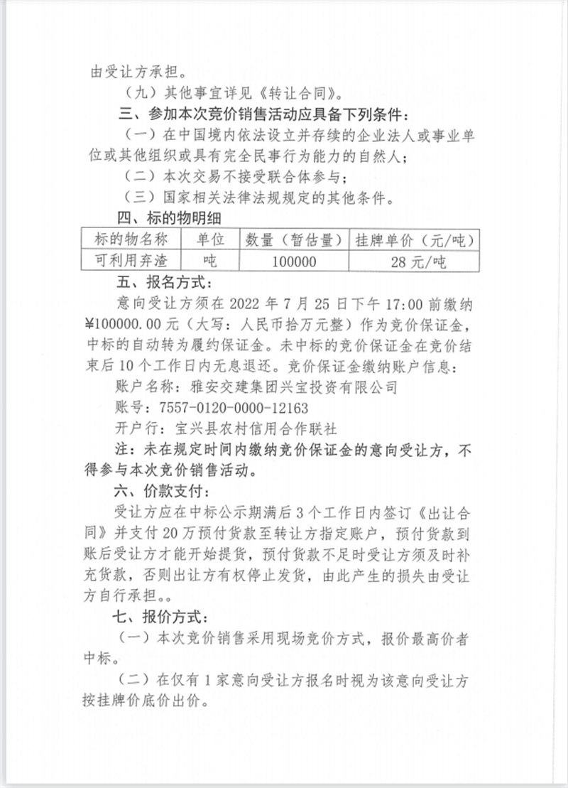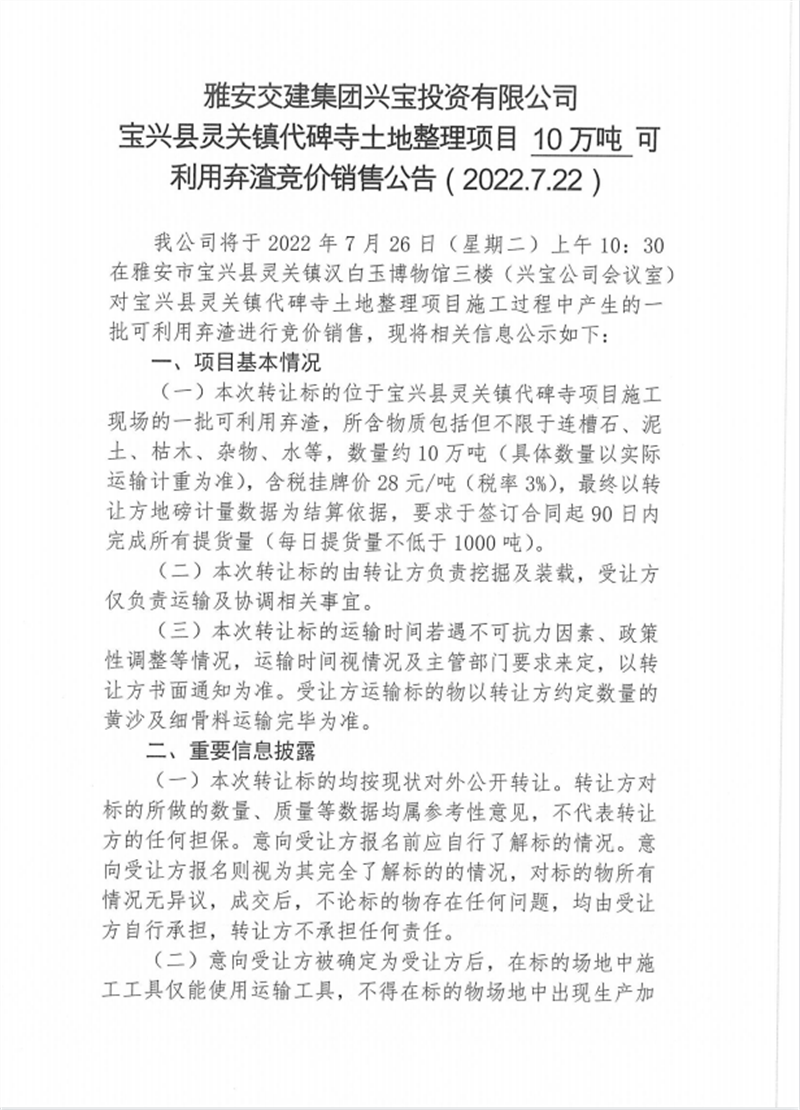 興寶公司寶興縣靈關(guān)鎮(zhèn)代碑寺土地整理項(xiàng)目10萬噸可利用棄渣競價(jià)銷售掛網(wǎng)公告7.22(10萬噸)