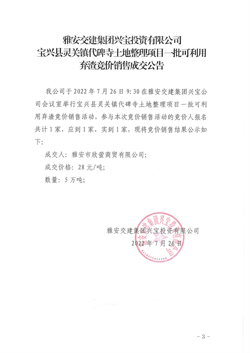 寶興縣靈關(guān)鎮(zhèn)代碑寺土地整理項(xiàng)目一批可利用棄渣競(jìng)價(jià)銷售成交公告7.26(10萬噸)
