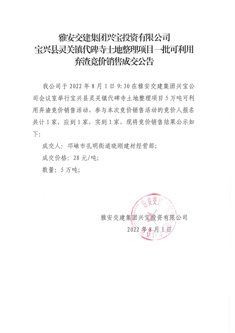 雅安交建集團(tuán)興寶投資有限公司靈關(guān)鎮(zhèn)代碑寺土地整理項(xiàng)目5萬(wàn)噸可利用棄渣競(jìng)價(jià)銷(xiāo)售成交公告(2022.8.1)