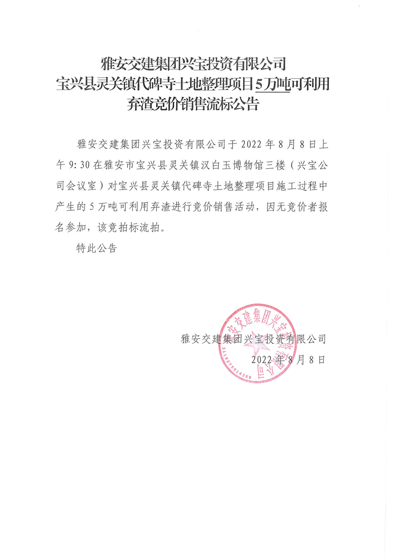 代碑寺土地整理項(xiàng)目5萬(wàn)噸可利用棄渣競(jìng)價(jià)銷售流標(biāo)公告
