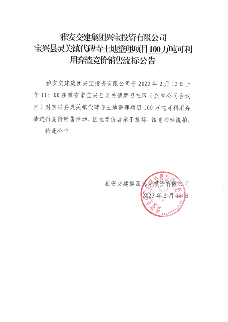 雅安交建集團興寶投資有限公司100萬噸可利用棄渣競價銷售流標公告(2023.2.13)