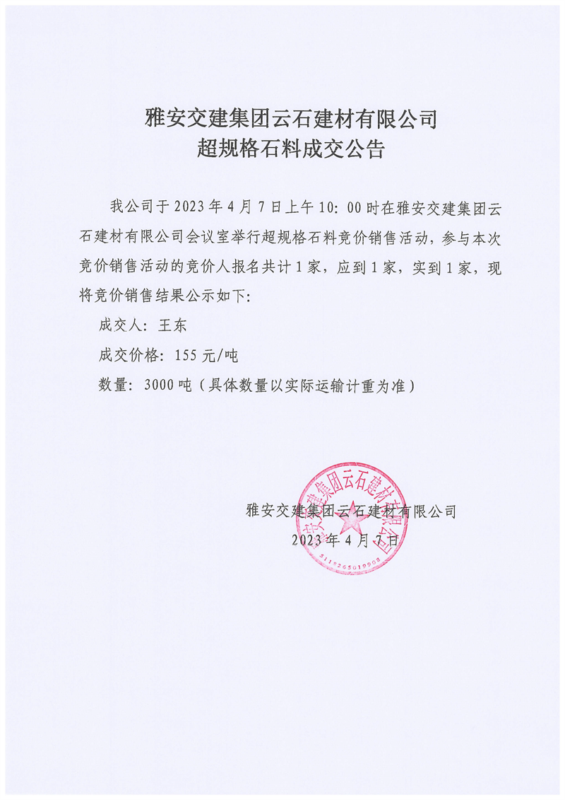 ÑŰ²½»½¨¼¯ˆF(tu¨¢n)ÔÆÊ¯½¨²ÄÓÐÏÞ¹«Ë¾³¬ÒŽ(gu¨©)¸ñʯÁÏÅÄÙu³É½»¹«¸æ£¨2023-4-7£©
