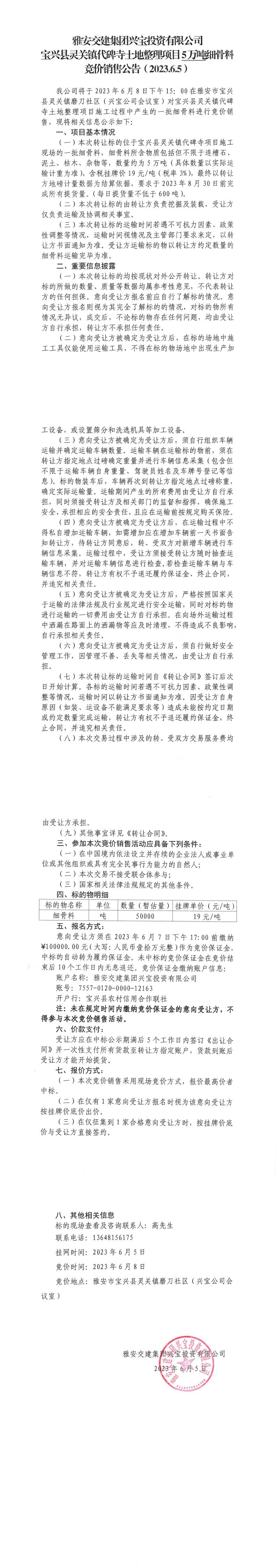 雅安交建集團(tuán)興寶投資有限公司寶興縣靈關(guān)鎮(zhèn)代碑寺土地整理項目5萬噸細(xì)骨料競價銷售公告(2023.6.5)