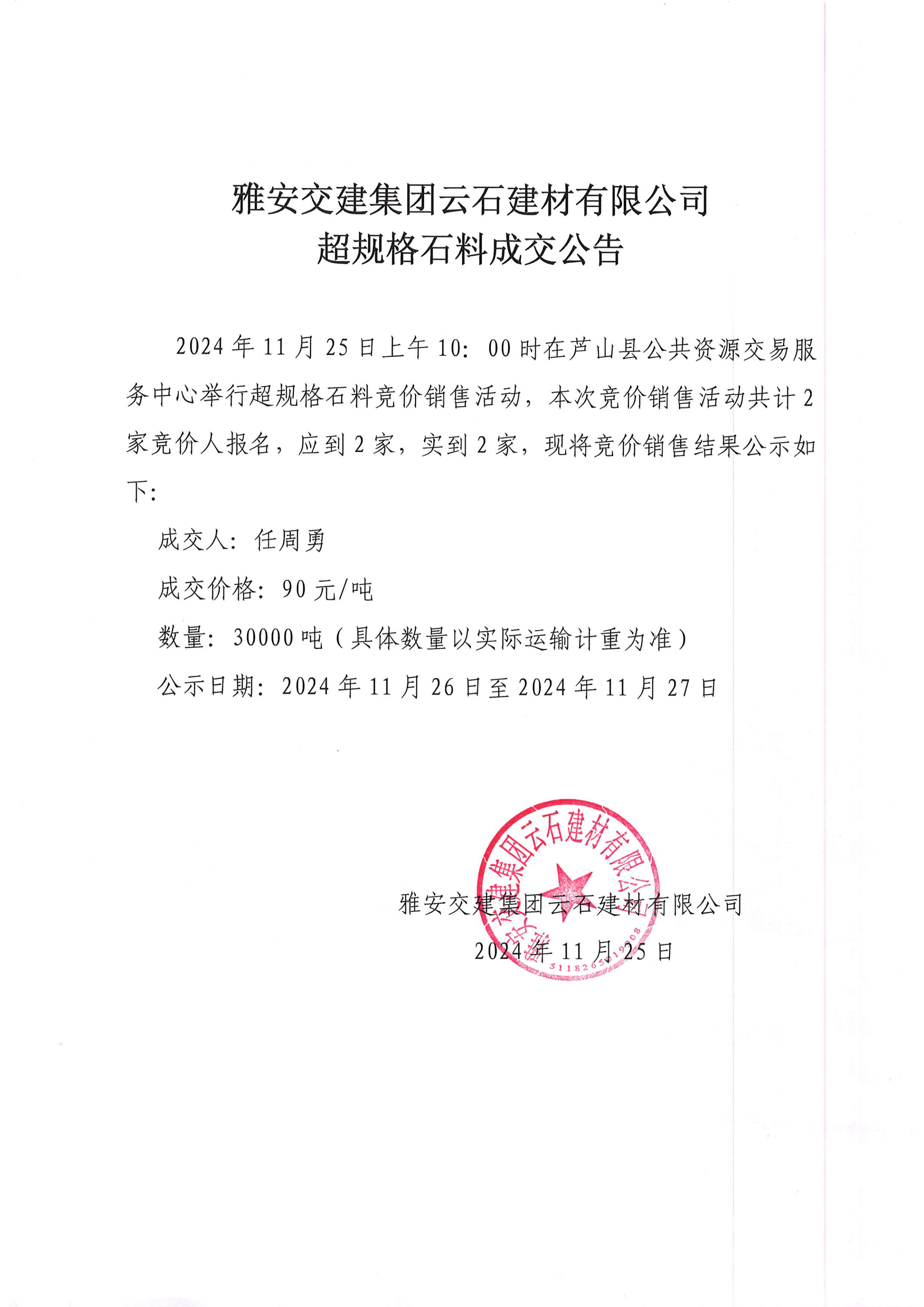 雅安交建集團(tuán)云石建材有限公司超規(guī)格石料競(jìng)價(jià)銷(xiāo)售成交公告(2024-11-26)