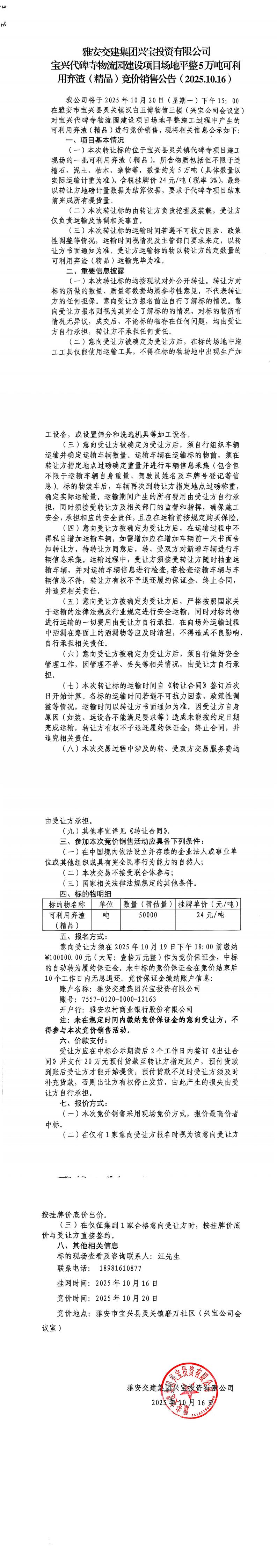 雅安交建集團(tuán)興寶投資有限公司寶興代碑寺物流園建設(shè)項(xiàng)目場(chǎng)地平整5萬(wàn)噸可利用棄渣(精品)競(jìng)價(jià)銷售公告(2025.10.16)