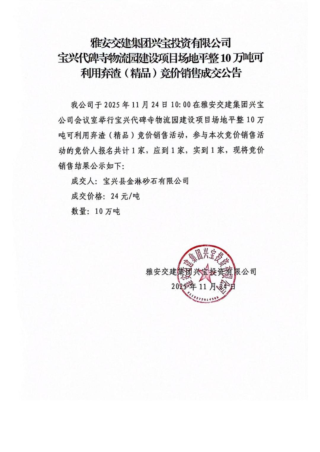 雅安交建集團(tuán)興寶投資有限公司10萬(wàn)噸可利用棄渣(精品)競(jìng)價(jià)銷(xiāo)售成交公告(2025.11.24)